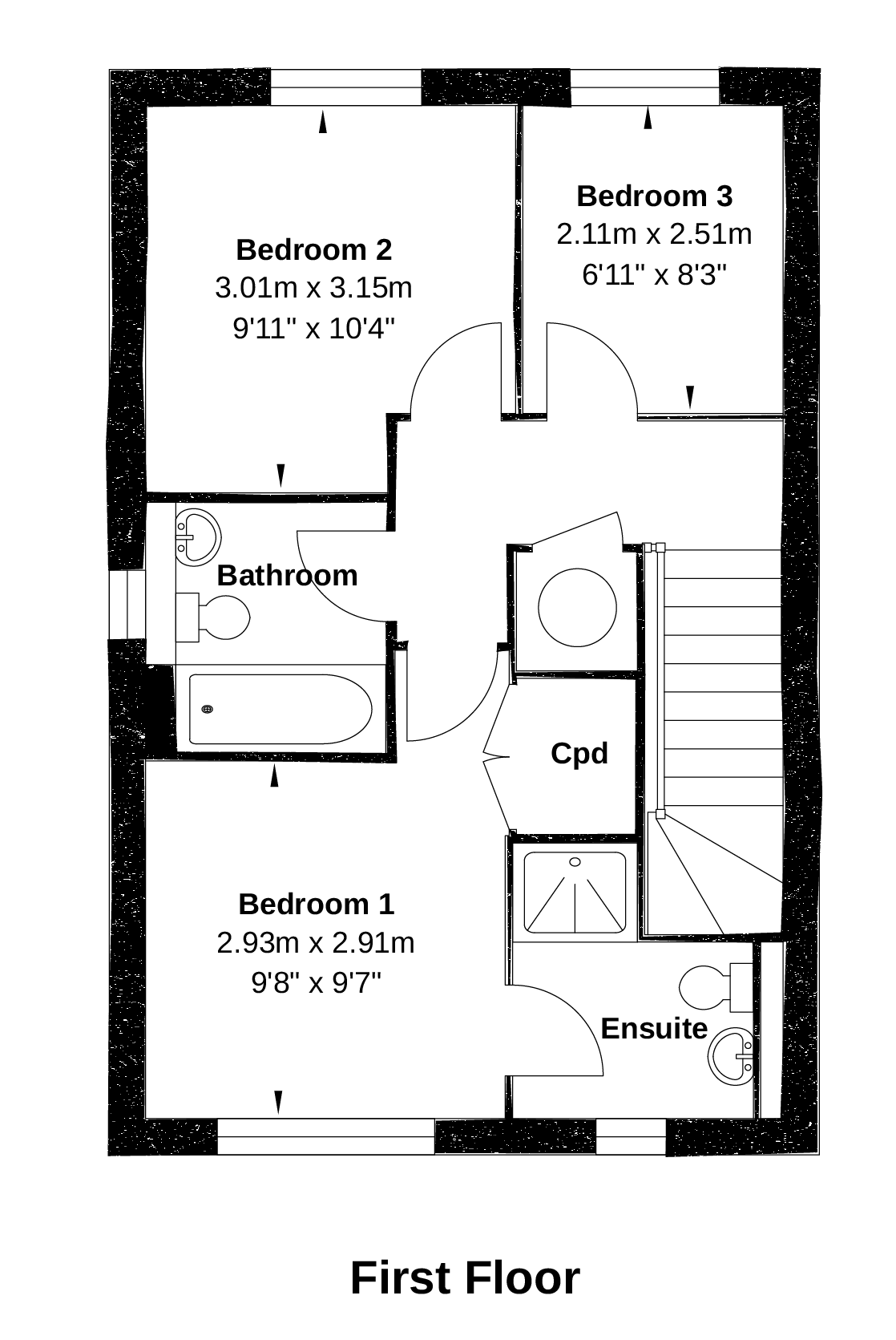 | Bedroom 3 | 2.11m x 2.51m – 9’11” x 8’3″ |